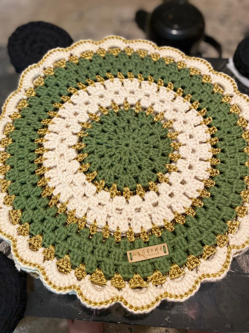 Sousplat Supreme de Crochê | Verde, Off e Dourado - 40cm | Produto Artesanal Premium